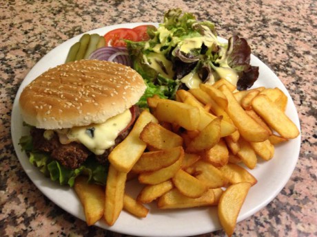 (Steak Haché Maison, Fromage, Salade, Tomate, Cornichon, Oignon, Frites)